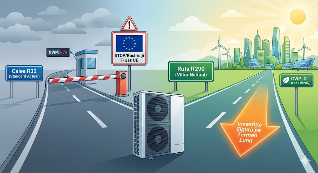 Daca esti in cautarea unei pompe de cadura, probabil ai observat ca specificatiile tehnice mentioneaza adesea tipul de agent frigorific: R32 sau R290. Alegerea agentului frigorific nu este un detaliu minor, influenteaza performanta, temperatura apei livrate si, cel mai important, durata de viata a investitiei tale in fata noilor reglementari europene.